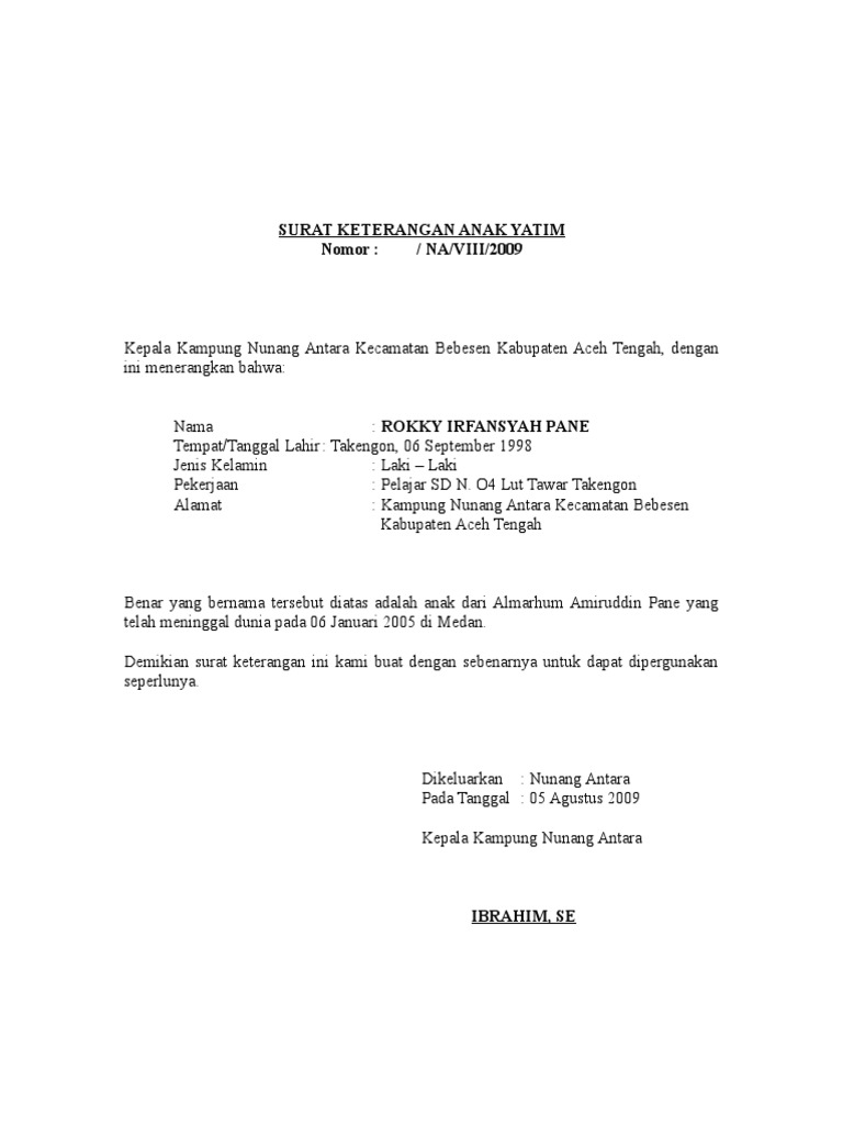 Contoh surat keterangan anak yatim. Berikut ini contoh surat keterangan anak yatim yang dikeluarkan oleh pemerintahan desa. Apakah surat keterangan anak yatim merupakan surat resmi? Untuk versi full, silahkan kunjungi post surat keterangan yatim piatu disini surat keterangan yatim piatu yang bertanda tangan dibawah ini lurah/kepala desa. Apabila pada proses download master file ms.word muncul notifikasi anda tidak memiliki akses download silahkan klick minta akses.