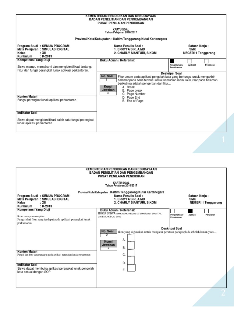Soal berupa 40 pilihan ganda diserta kunci jawabanya dan 5 soal uraian atau esai.
