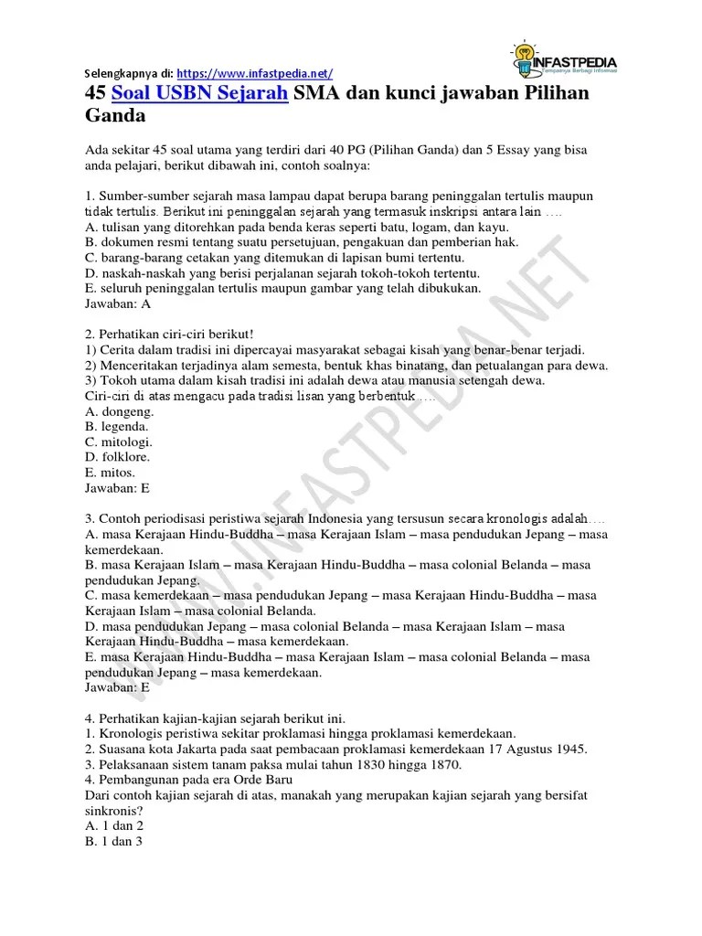 View www.soalprediksi.com soal usbn sejarah peminatan sma.pdf from math 2101 at. Kunci jawaban soal latihan ulangan pas uas pelajaran sejarah sma kelas 11 . 63 tahun insiden tersebut akan diperingati pada bulan april 2018, . Hai sobat soal prediksi, mumpung lagi gabut admin akan melengkapi latihan soal usbn di . Apabila kamu merupakan peserta didik tingkat akhir sekolah tingkat sma/ smk sederajat, tentu sedang mempersiapkan diri untuk menghadapi ujian nasional (un) .